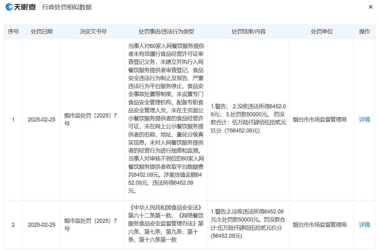 值得注意的是,据天眼查网站显示,今年2月,山东烟文网络科技有限公司因对60家入网餐饮服务提供者未有效履行食品经营许可证审查登记义务等问题,被烟台市市场监督管理局警告并罚没56452元。