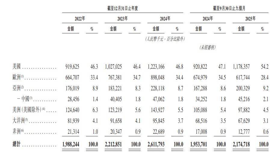 招股书显示,2022年至2024年及2025年前9个月,公司境外销售收入占比分别高达98.6%、98.2%、98.2%及97.9%。其中,美国及欧洲市场贡献了超八成的营收。