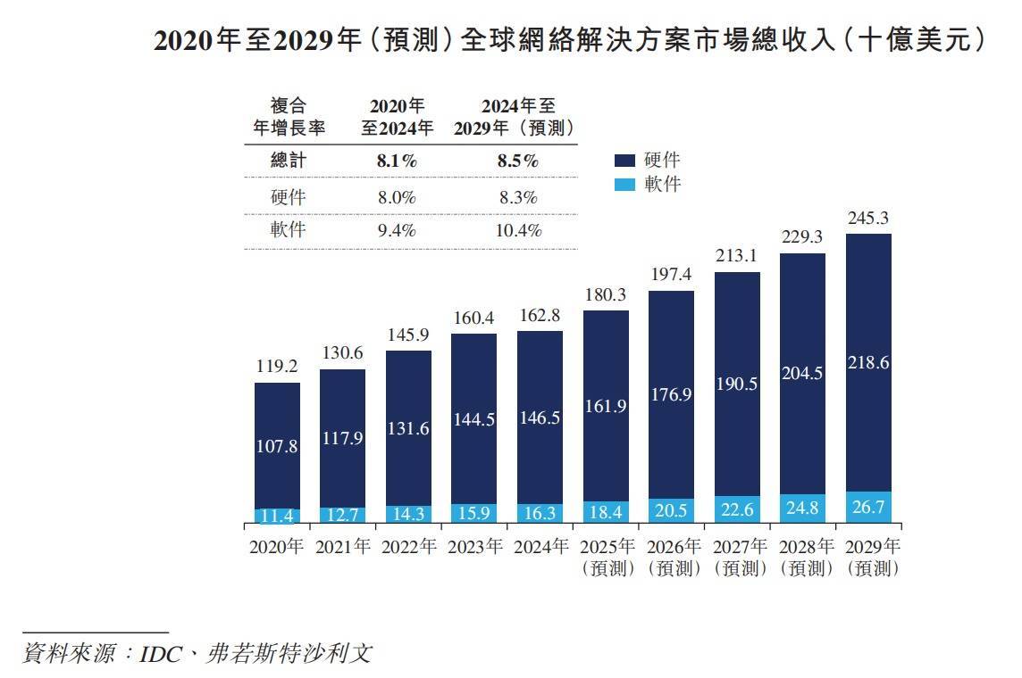 三次递表在AI算力需求爆发的当下,网络基础设施作为“卖铲人”的角色价值正在重估。随着对高速网络传输需求的持续攀升,机构预计,2024年至2029年全球网络解决方案市场规模将持续扩大,复合年增长率将达到8.5%。