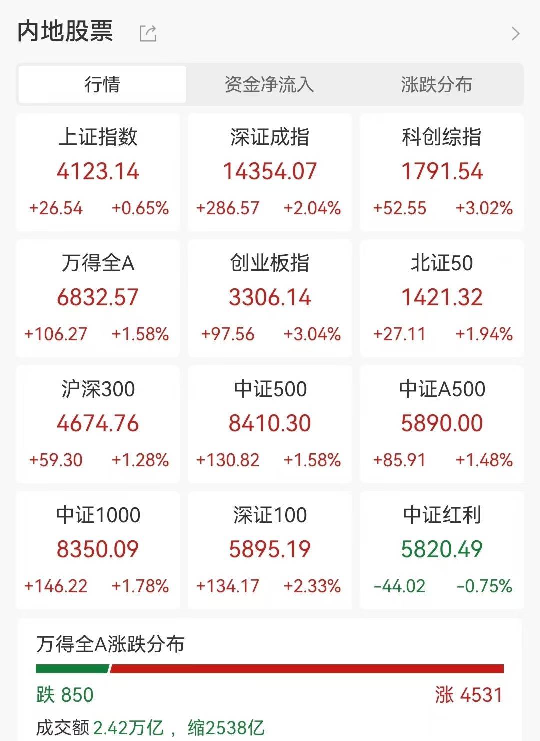 【大河财立方消息】3月10日,A股市场高开高走,截至收盘,沪指涨0.65%,深证成指涨2.04%,科创综指涨3.02%,创业板指涨3.04%。沪深北三市全天成交额2.42万亿元,较上一个交易日缩量2538亿元。
