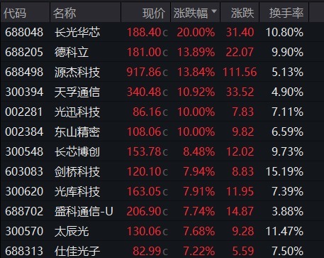 光模块(CPO)概念股午后爆发,长光华芯20CM涨停,东山精密、光迅科技、拉升封死涨停板,德科立、源杰科技、天孚通信、长芯博创等多股跟涨。