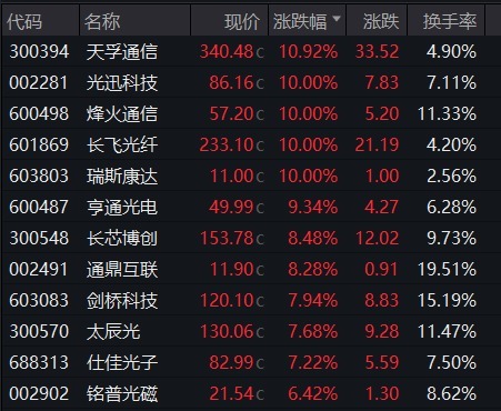 光纤概念午后持续走强,光迅科技、长飞光纤、烽火通信、瑞斯康达等多股涨停。