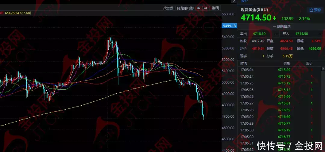 隔夜网上配资公司,现货黄金收盘暴跌186.51美元,跌幅3.73%,报4818.67美元。今日欧市盘中,黄金大幅下跌,一度跌至4686.09美元,目前在4713美元附近徘徊。