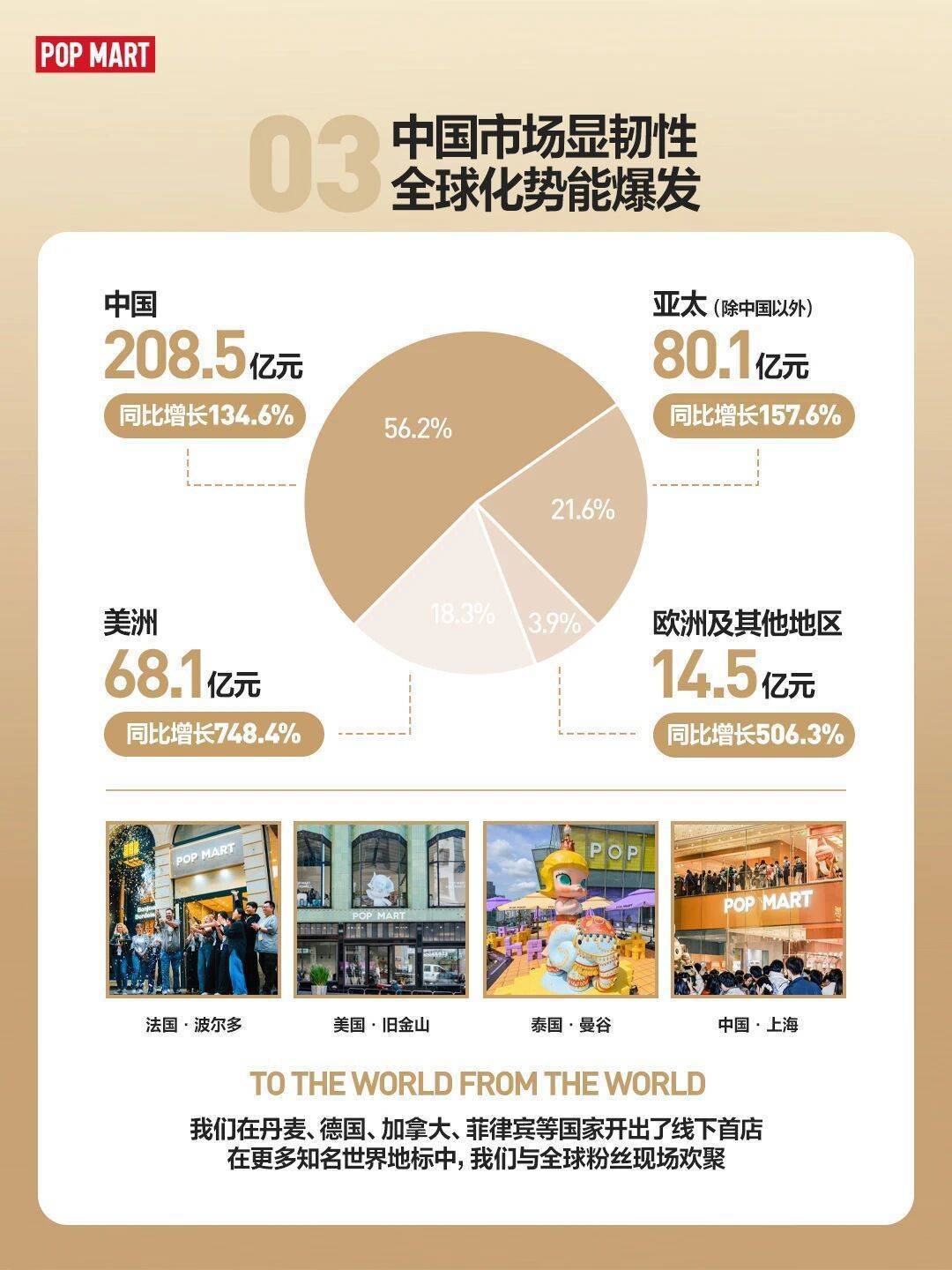 泡泡玛特年报来了!3月25日,泡泡玛特发布2025年度业绩公告,全年营收371.2亿元,同比增长184.7%,业绩再创新高。同期公司经调整净利润130.8亿元,同比增长284.5%,盈利水平大幅提升。核心IP表现突出,LABUBU家族营收141.6亿,首次突破百亿,中国市场全年营收208.5亿元,同比增长134.6%。另有六大IP均破20亿元,17个IP营收过亿。泡泡玛特在中国市场表现突出。亚太市场实现营收80.1亿元,同比增长157.6%;美洲市场实现营收68.1亿元,同比增长748.4%;欧洲及其他地区实现营收14.5亿元,同比增长506.3%,全球四大区域均实现了三位数增长。