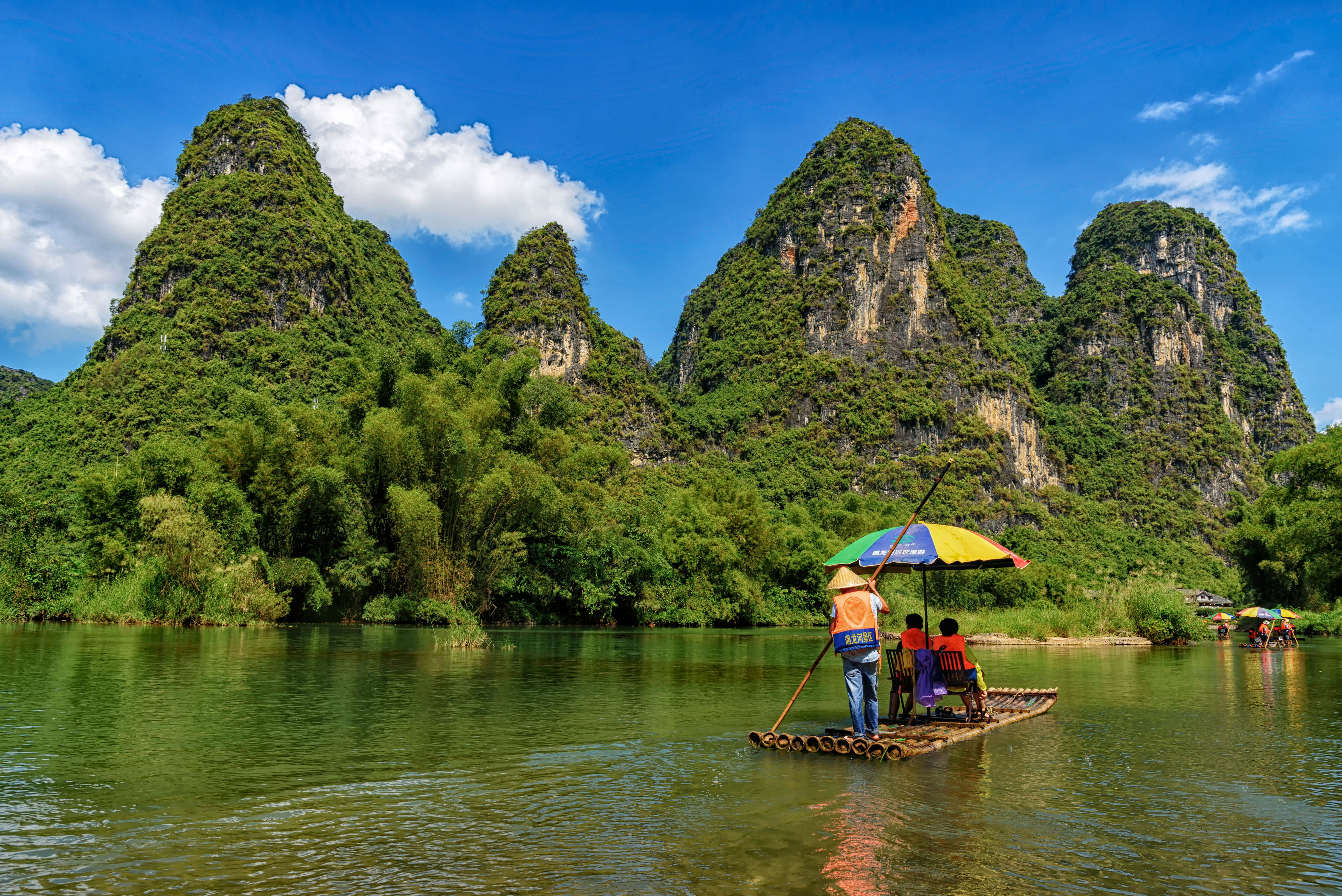 畅游漓江,感受桂林的烟雨。水墨漓江,丹青桂林,漓江的水清澈如碧,宛如一条青罗带盘旋在群峰之中,风光秀丽。乘坐竹筏,穿梭在山林之间,将两岸美景尽收眼底,碧水悠悠,奇峰倒影,非常诗意美好。