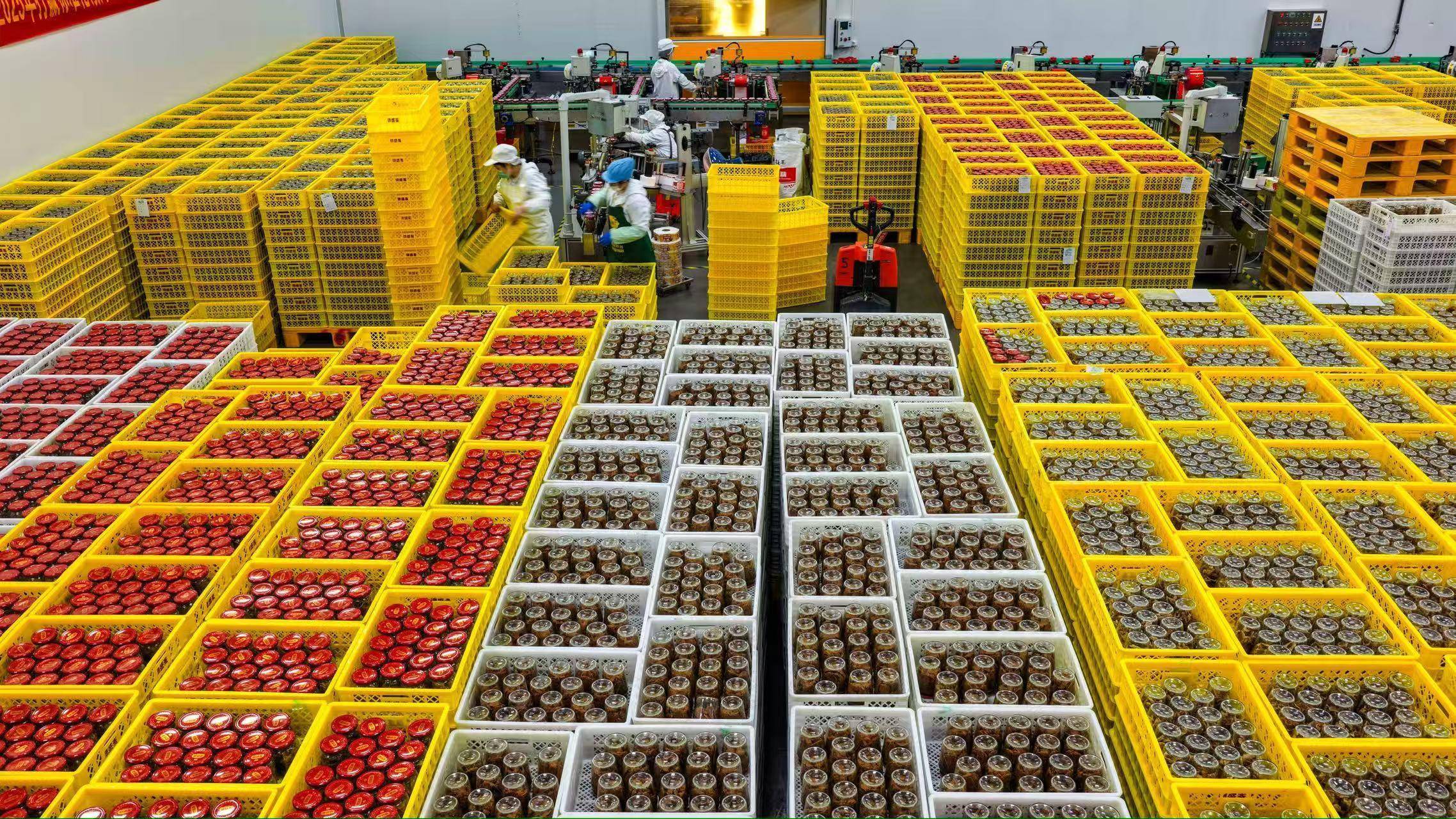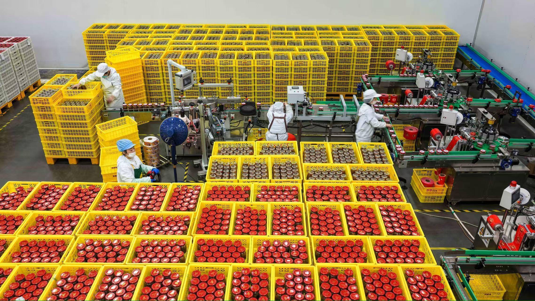 2026年2月3日,山东金鹏德盛斋扒鸡有限公司鱼罐头生产车间,员工正在赶制订单产品(无人机照片)。