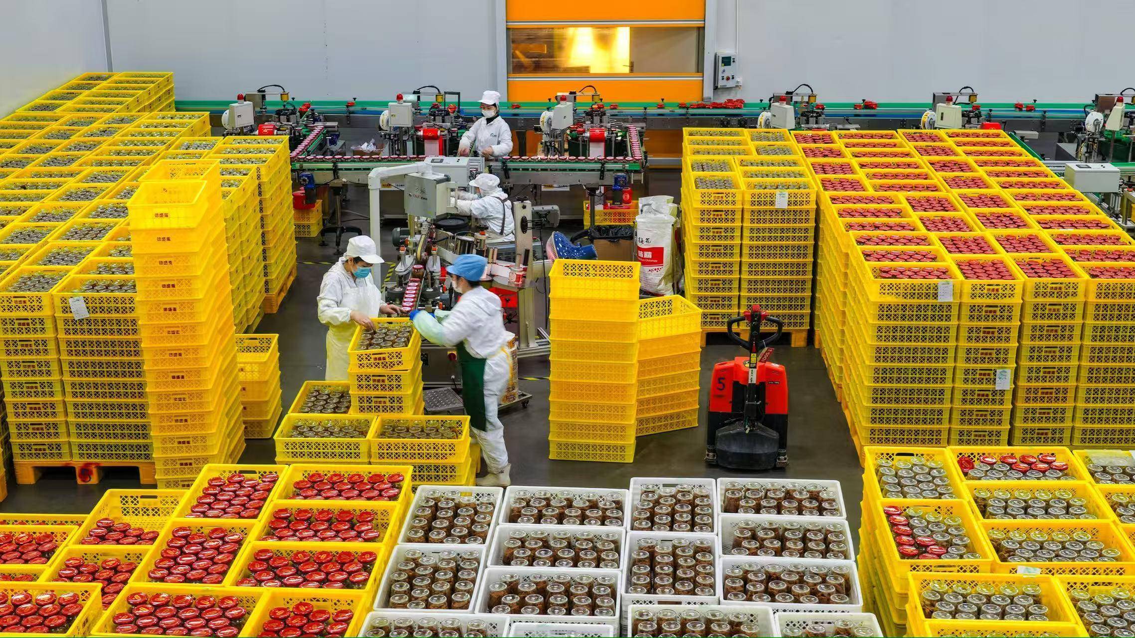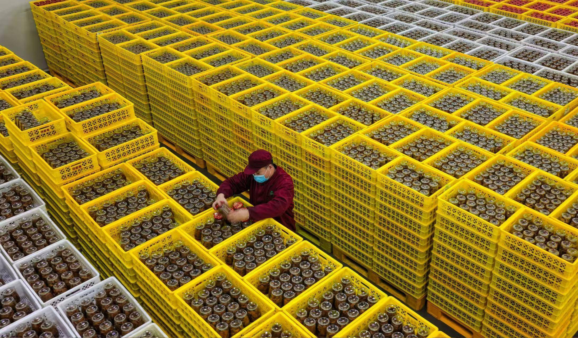 2026年2月3日,山东金鹏德盛斋扒鸡有限公司鱼罐头生产车间,员工正在检查订单产品。