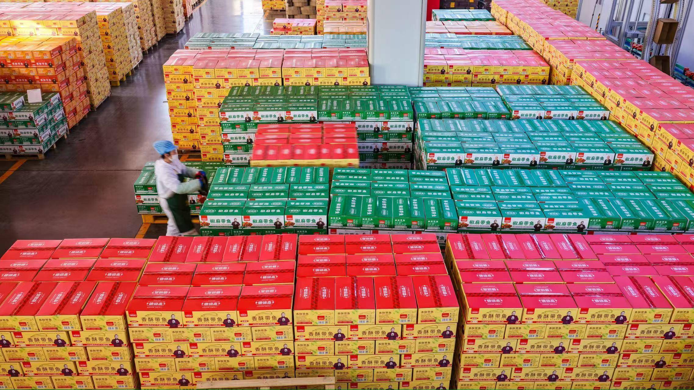 2026年2月3日,山东金鹏德盛斋扒鸡有限公司扒鸡包装车间,员工正在运输订单产品。