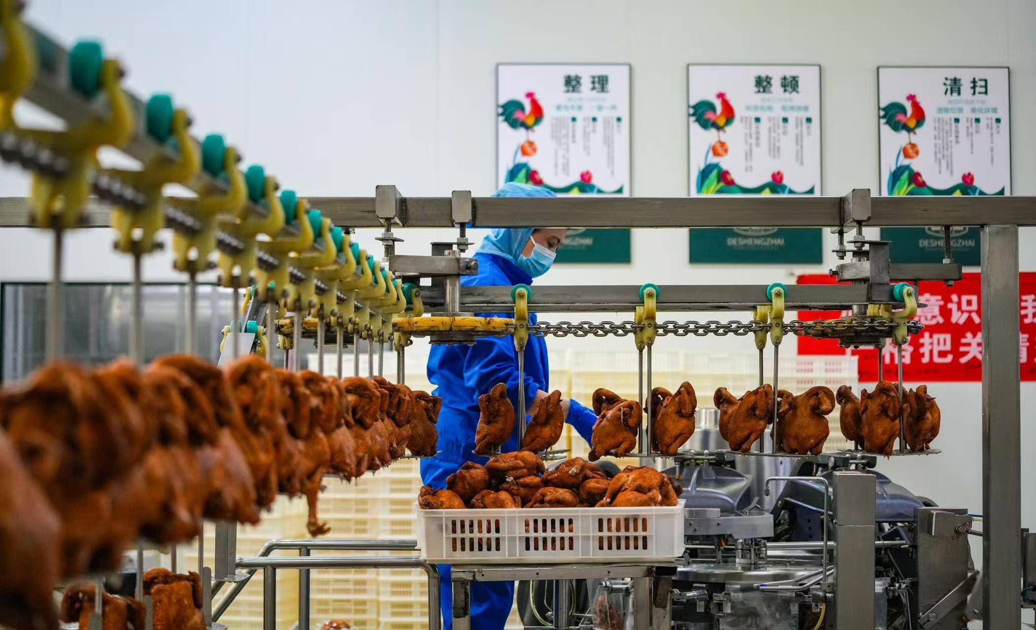 2026年2月3日,山东金鹏德盛斋扒鸡有限公司扒鸡生产车间,员工正在赶制扒鸡制品。