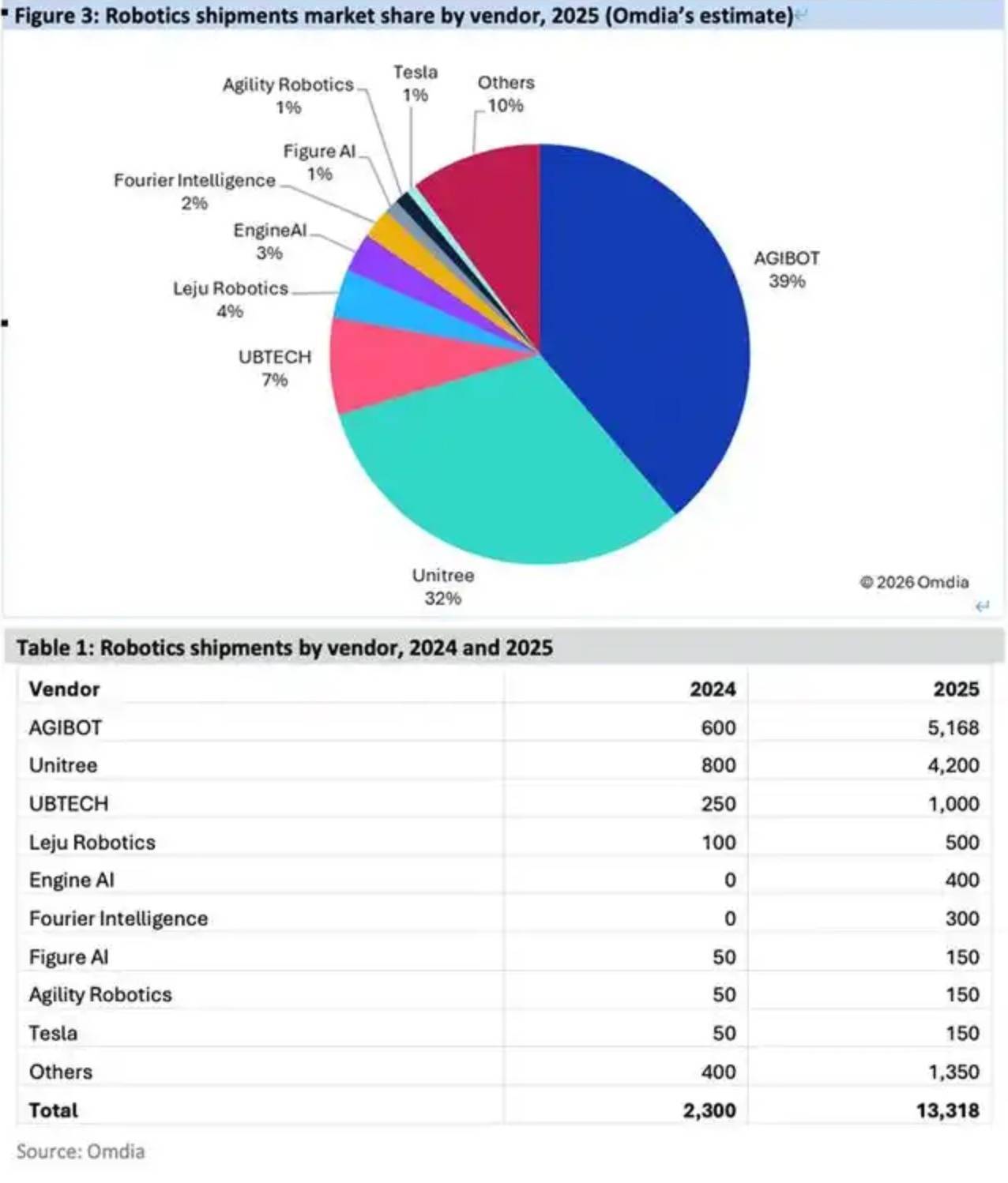 另据Omdia发布的《通用具身机器人市场雷达》报告,智元以5168台的年度出货量占据全球39%的市场份额,宇树科技以4200台出货量占据32%的市场份额,分列第一、二名;优必选、乐聚机器人、众擎机器人、傅利叶智能,则紧随其后,包揽第三至第六。